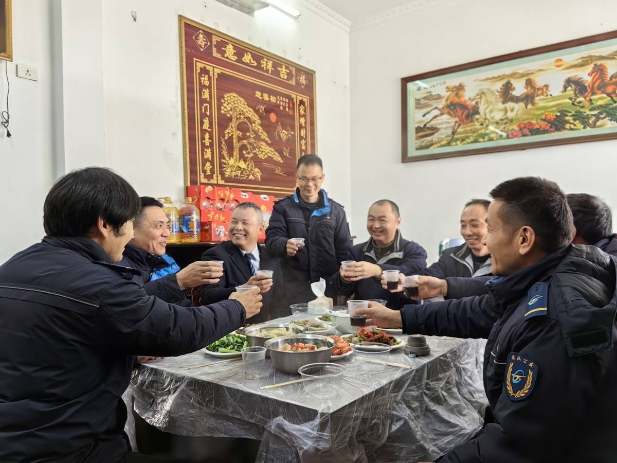 为让员工们感受浓浓年味,队长赵阳也带着管理人员从汉口赶了过来,带的春联、“福”字、灯笼、大红苹果等,瞬间为这个特殊除夕增添了浓浓的年味,又红又大的苹果则寓意出入平安,福满多多。